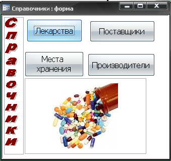 По нажатию кнопки справочники появляется форма «Справочники» (рис.1.14). Для оформления данной формы также были использованы графические возможности Microsoft Access: добавлен рисунок и надпись в стиле «WordArt». Форма справочники обеспечивает навигацию с таблицами «Лекарства», «Поставщики», «Места хранения», «Производители». По нажатию на одноименные кнопки появятся формы к указанным таблицам, позволяющие осуществлять ввод данных.