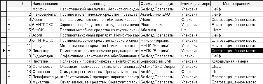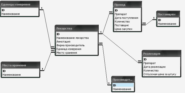 ЛЕКАРСТВО (ИД_ЛЕКАРСТВА, НАЗВАНИЕ_ЛЕКАРСТВА, АННОТА-ЦИЯ, ФИРМА_ПРОИЗВОДИТЕЛЬ, ЕДИНИЦА_ИЗМЕРЕНИЯ, МЕСТО_ХРА-НЕНИЯ).