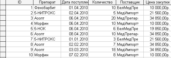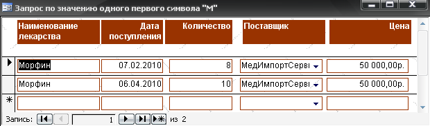 Запрос к БД по значению одного первого символа позволяет получить информацию по приходу всех лекарственных препаратов, название которых начинается с буквы «М» (рис. 1.3).