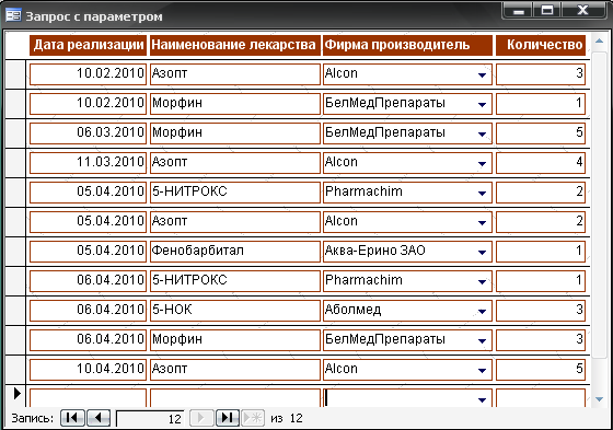 Ленточные автоформы также были созданы для запросов, организованных к БД «Аптека», например для запроса с параметром (рис. 1.12).