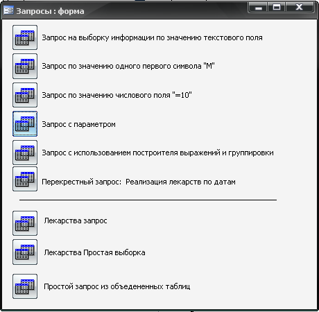 Форма «Запросы» (рис. 1.15), которая доступна по нажатию одноименной кнопки на главной форме «Аптека», обеспечивает быстрый и удобный доступ к запросам, реализованным к БД в рамках данной курсовой работы.