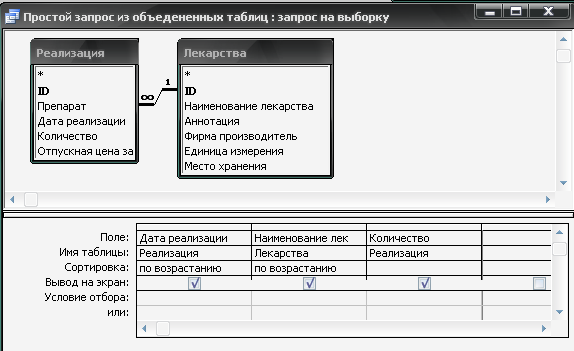Для работы с БД был создан запрос из объединенных таблиц («Лекарства» и «Реализация») – рис. 1.9-1.10.