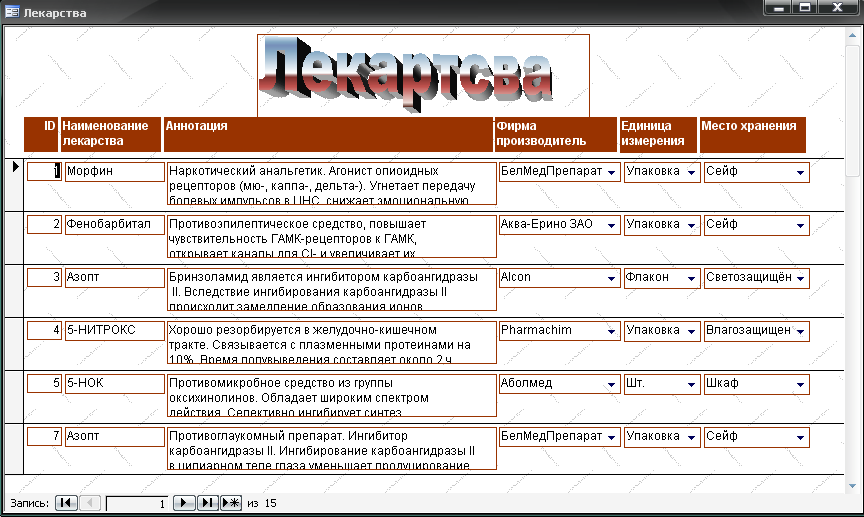 С помощью инструментария Access для таблицы был созданы ленточные автоформы, которые позволяют с легкостью добавлять новые записи. На рис. 1.11.представлена одна из ленточных автоформ − «Лекарства». Всего было создано 7 подобных автоформ, для каждой из таблицы БД «Аптека». Для создания автоформы «Лекарства» использован графический инструментарий «WotArt», что позволило создать красочную надпись «Лекарства» (рис. 1.11).