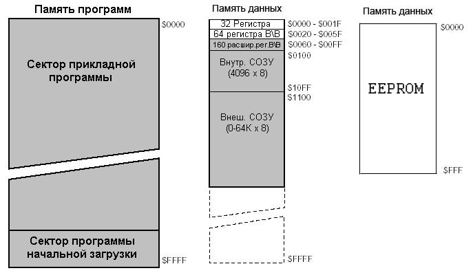 -Память данных имеет 8-разрядную организацию. Младшие 32 адреса пространства занимают регистры общего назначения, далее следуют 64 адреса регистров ввода-вывода, затем внутреннее ОЗУ данных объемом до 4096 ячеек. Возможно применение внешнего ОЗУ данных объемом до 60 Кбайт;