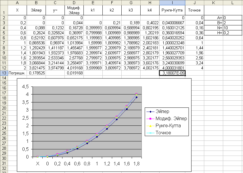 Здесь решается уравнение dy/dx = 2x-y+x2 на интервале [0,2], начальное значение y(0)=0, для оценки точности задано также точное решение в виде функции u(x)=x2. Оценка погрешности делается в нормеL>1>, как и принято в данном случае