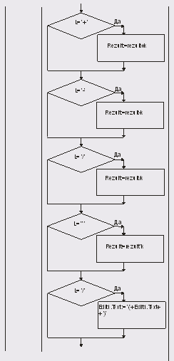 В самом начале любой программы, сделанной на Delphi, объявляется переменная формы(Form1), которую Delphi создаёт автоматически при создании проекта. Потом собственноручно объявляются две переменные (l,Chars) строкового типа(String). Так же объявляются три переменные (k,m,i) целочисленного типа(Integer) и одну переменную (rezult) типа (real). И дальше идут основные процедуры программы. Самая основная процедура– это процедура – Button1Click.