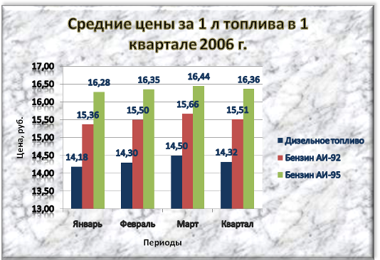 Цель решения задачи: на основании исходных данных необходимо рассчитать среднюю цену 1 л. топлива по каждому виду за месяц, а также за квартал 2006 г., сформировать и заполнить сводную ведомость затрат на приобретение топлива за квартал и представить полученные данные в графическом виде.