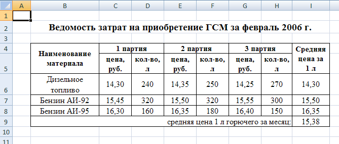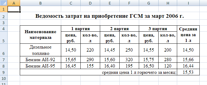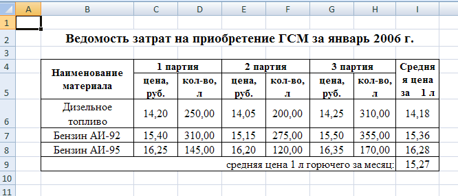 Выполняем расчет средней цены 1 л горючего за месяц: в ячейку I9 вводим формулу =СУММ(I6:I8)/3.