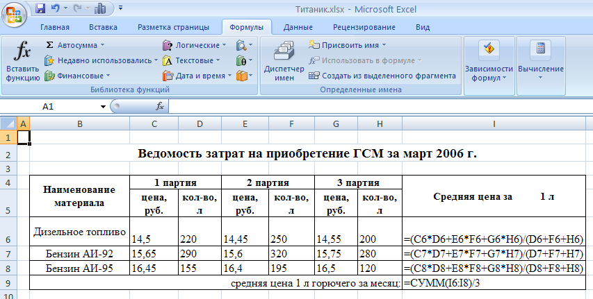 Выполняем расчет средней цены 1 л дизельного топлива по каждому виду: в ячейку I6 вводим формулу =(C6*D6+E6*F6+G6*H6)/(D6+F6+H6), Подведя указатель мыши к нижнему правому углу ячейки I6, нажав левую кнопку мыши и удерживая ее, копируем функцию до ячейки I8.