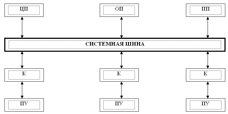 (ЦП - центральный процессор, ОП – оперативная память, ПП – постоянная память, К – контроллер, ПУ – периферийное устройство).