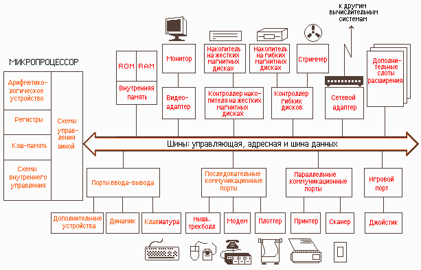 Достижения микроэлектроники позволили объединить в одной сверхбольшой интегральной схеме, называемой микропроцессором (МП) или процессором, АЛУ и УУ. Уменьшение габаритов ОЗУ позволило разместить МП и ОЗУ на одной электронной плате, называемой системной, или материнской. Все связи между отдельными устройствами объединены в пучок параллельных проводов – локальную или системную шину. В состав этой шины входят шина данных, по которой передаются из ОЗУ в МП также и команды, шина адреса и шина управления. УВВ включают УВВ и управляющие ими контроллеры (карты), включаемые в системную плату или установленные прямо на ней.