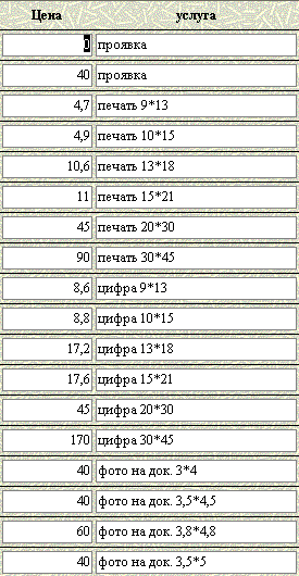 Поле со списком Таблица или запрос Источник: ”Цена услуги” |