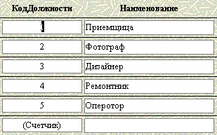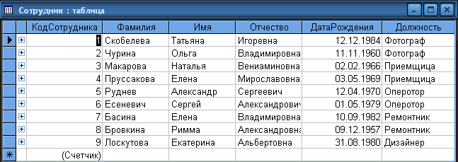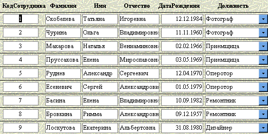 В таблице содержится информация о коде, ФИО, дате рождения и должности сотрудника.