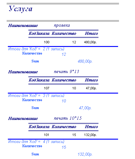 Данный отчет выводит информацию о количестве заказов, количестве заказанных фото и общей стоимости заказов по каждой услуге.
