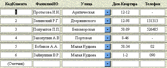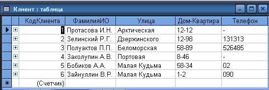 В таблице содержится полная информация о клиенте (Код клиента, ФИО, адрес, телефон )