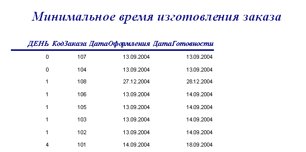 SELECT Заказ. Код Заказа, Заказ. Дата Оформления, Заказ. Дата Готовности, (DateDiff('d',[Заказ]![Дата Оформления],[Заказ]![Дата Готовности])) AS ДЕНЬ