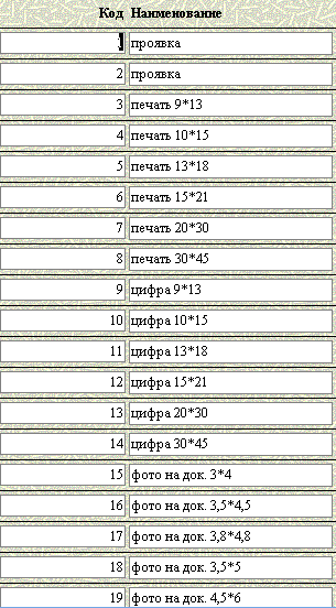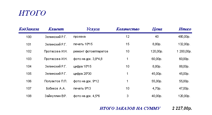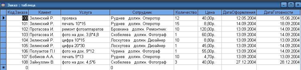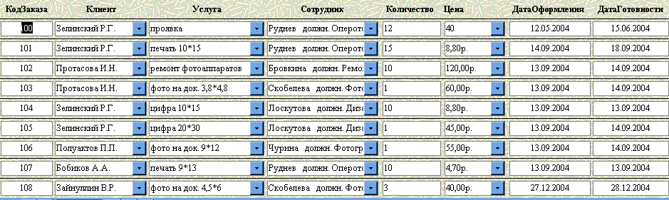 В таблице содержится полная информация о заказе (код заказа, ФИО клиента, наименование услуги, фамилия сотрудника, количество, цена за данный вид услуги, дата оформления и дата готовности)
