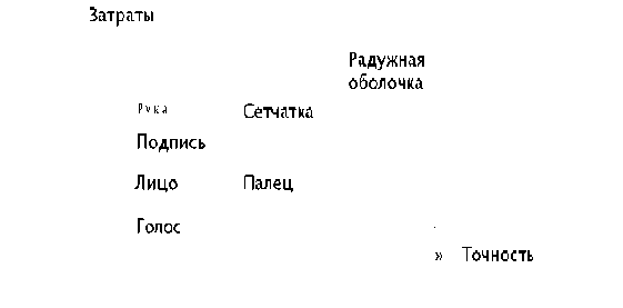 Биометрические идентификаторы обеспечивают очень высокие показатели: вероятность несанкционированного доступа - 0,1 - 0,0001 %, вероятность ложного задержания - доли процентов, время идентификации - единицы секунд, но имеют более высокую стоимость по сравнению со средствами атрибутной идентификации. Качественные результаты сравнения различных биометрических технологий по точности идентификации и затратам указаны на рис. 2. Известны разработки СКУД, основанные на считывании и сравнении конфигураций сетки вен на запястье, образцов запаха, преобразованных в цифровой вид, анализе носящего уникальный характер акустического отклика среднего уха человека при облучении его специфическими акустическими импульсами и т. д.