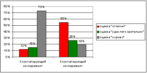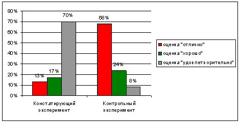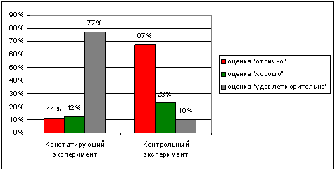 На диаграмме хорошо видно, что при изучении раздела с помощью мультимедиа курса процент учащихся, усвоивших материал на оценку «отлично» в 8 «а» классе составил 68 % и этот показатель выше, чем в контрольной группе (в 8 «б» – 50 %). Процент учащихся, усвоивших раздел на «удовлетворительно» в экспериментальной группе составил всего 8 %, когда этот же показатель в 8 «б» был выше (14 %). По результатам тестирования можно сделать вывод, что изучение материала с помощью мультимедиа курса «Графические возможности языка программирования Basic и Pascal» дал более высокий уровень усвоения материала.