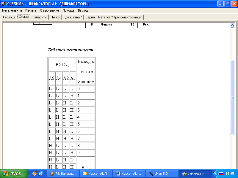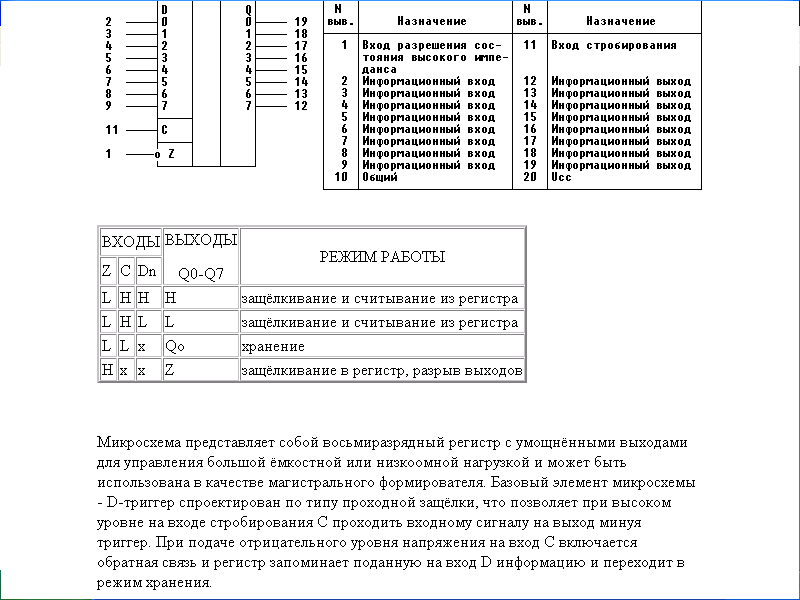 Микросхема представляет собой функционально законченный 10-разрядный АЦП [2], сопрягаемый с микропроцессором. Обеспечивает преобразование как однополярного напряжения (вывод 15 соединяется с выводом 16) в диапазоне 0...9,95 В, так и биполярного напряжения в диапазоне -4,975...+4,975 В в параллельный двоичный код. В состав ИС входят ЦАП, компаратор напряжения регистр последовательного приближения (РПП), источник опорного напряжения (ИОН), генератор тактовых импульсов (ГТИ), выходной буферный регистр с тремя состояниями, схемы управления. Выходные каскады с тремя состояниями позволяют считывать результат преобразования непосредственно на шину данных микропроцессора. По уровням входных и выходных логических сигналов сопрягаются с ТТЛ-схемами. В ИС выходной ток ЦАП сравнивается с током входного резистора от источника сигнала и формируется логический сигнал РПП. Стабилизация разрядных токов ЦАП осуществляется встроенным ИОН. Тактирование РПП обеспечивается импульсами встроенного ГТИ с частотой следования 300...400 кГц. Установка РПП в исходное состояние и запуск его в режим преобразования производится по внешнему сигналу "гашение и преобразование". По окончанию преобразования АЦП вырабатывает сигнал "готовность данных" и информация из РПП поступает на цифровые входы через каскады с тремя состояниями.