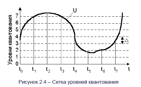 Процесс дискретизации заключается в том, что из непрерывного во времени сигнала (в рассматриваемом случае таким сигналом является напряжение) выбираются отдельные его значения, соответствующие тактовым моментам времени, следующим через определенный временной интервал Т, называемый тактовым интервалом. Операция квантования состоит в округлении значений аналогового напряжения, выбранных в тактовые моменты времени, до ближайшего уровня квантования (рисунок 1). Уровни квантования сдвинуты друг относительно друга на величину Δ, называемую шагом квантования. Каждому уровню квантования присваивается порядковый номер (0, 1, 2, 3 и т.д.).