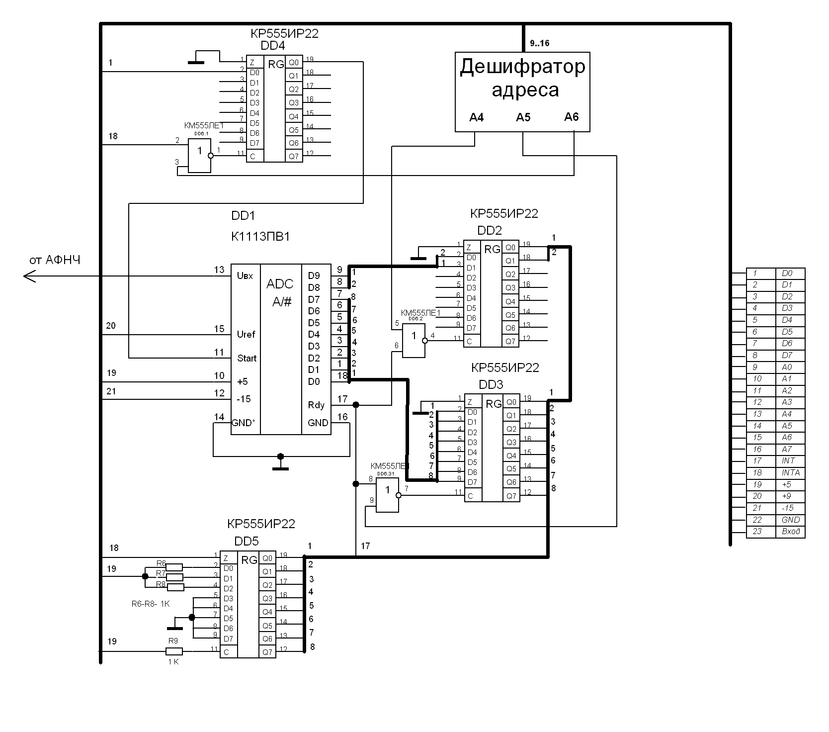 Схема подключения блока АЦП к МПС представлена на рис. 7. Микросхемы DD2 и DD3 регистры для старших разрядов данных и младших соответственно. Их входы соединены непосредственно с выходами микросхемы АЦП, а выходы идут на шину данных. Запись происходит при готовности АЦП- сигналом Rdy и сигналом от дешифратора на вход С регистров.