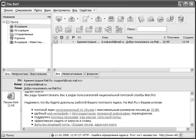 "Получить новую почту" - после нажатия на эту кнопку начинает валиться корреспонденция, уже осевшая на сервере в почтовом ящике. Если нажали на эту кнопку, не будучи подключенными к Сети, то программа The Bat предложит произвести подключение к одному из удаленных серверов с помощью встроенной подпрограммки дозвона.
