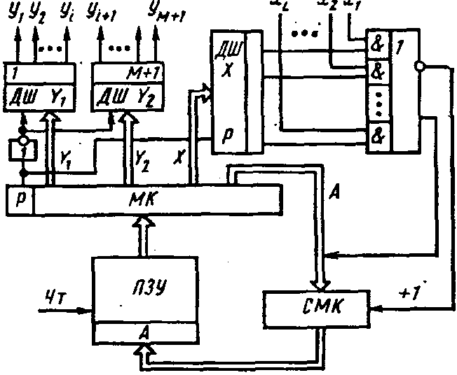 С помощью дешифратора ДШУ вырабатывается соответствующий выходной сигнал y>j>, а с помощью ДШХ определяется номер логического условия X>i>, проверяемого в данном такте. В зависимости от значения X>i>, прошедшего через схему выбора ЛУ, и информации, поступающей из адресного поля А, устройство формирования адреса следующей МК (УФ АМК) вырабатывает адрес ячейки ПЗУ, содержимое которой будет переписано в РМК в следующем такте. На УФ АМК может также поступать внешний управляющий сигнал V, обеспечивающий, например, выбор определенного алгоритма из тех, чьи микропрограммы хранятся в ПЗУ автомата.