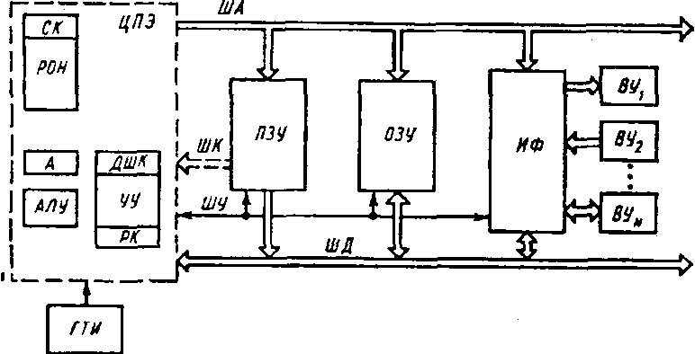 МПВУ минимальной конфигурации содержит ЦПЭ, блоки ПЗУ и ОЗУ, генератор тактовых импульсов ГТИ и блок интерфейса (ИФ), через который осуществляется связь с внешними устройствами (ВУ). Будем считать, что МПВУ, представляющее собой специализированное вычислительное устройство, используется в аппаратуре для выполнения некоторого заданного алгоритма обработки информации (или совокупности алгоритмов).
