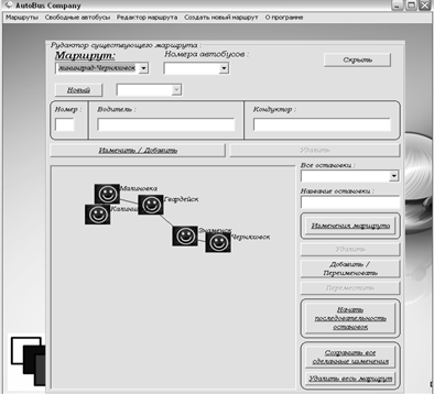 Для хранения названий маршрутов, номеров автобусов( как задействованных, так и свободных) и названий остановок используются элементы управления Combo_Box; для прорисовки маршрутов – Picture_Box; для обозначения остановок – Image_Box.