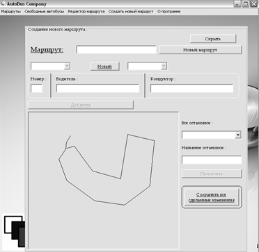 Для записи названия маршрута, имен водителя и кондуктора, а также названия остановки (если нужно задать ей свое имя) используются элементы управления Text_Box; для хранения номеров автобусов( как прикрепленных к создаваемому маршруту, так и еще свободных) – Combo_Box; для рисования своего произвольного маршрута – Picture_Box.