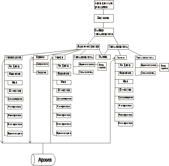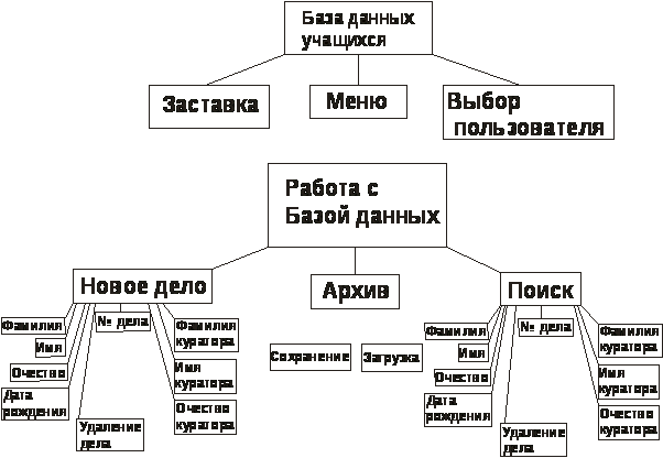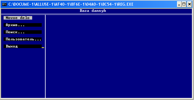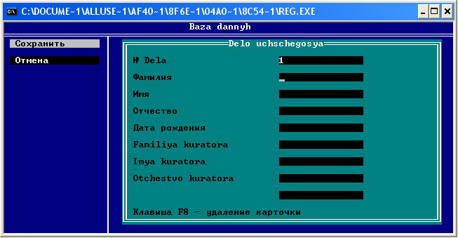 Далее следует меню, состоящее из подпунктов: Новое дело, Архив, Поиск, Выбор пользователя, Выход. Если будет выбран «Администратор», тогда вы можете завести новые дела на учащихся, сохранять изменение (создавать) базы данных или загружать уже существующие базы, далее можете воспользоваться поиском тех или иных учащихся для удаления или корректировки данных, выбор пользователя – замена пользователя, допустим с «Администратора» на «Пользователя», выход – из данной программы. Клавиши и подпункты: (для перемещения по подпунктам используются клавиши: Вверх, влево, вправо, вниз. Для перемещения по ячейкам данных используется клавиша «TAB». Для удаления конкретного дела учащегося используйте клавишу «F8». Клавиша для принятия «Enter».