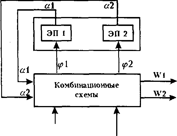 Для правильной работы схем, очевидно, нельзя разрешать, чтобы сигналы на входе запоминающих элементов непосредственно участвовали в образовании выходных сигналов, которые по цепям обратной связи подавались бы в тот же самый момент времени на эти входы. В связи с этим запоминающими элементами должны быть не автоматы Мили, а автоматы Мура (см. уравнения функционирования этих автоматов).
