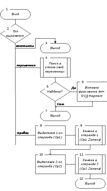 Действия данной операции определяются схемой на рисунке 7 и складываются из следующего. Состав выполняемых действий зависит от типа обрабатываемого элемента выражения.