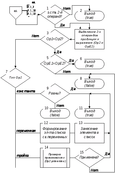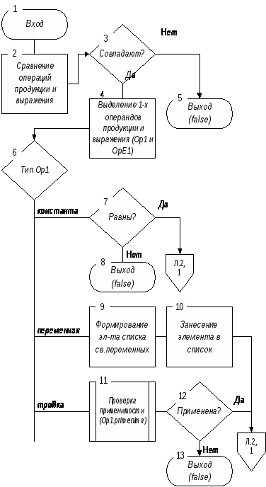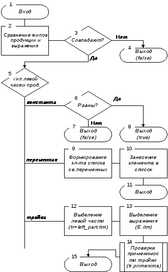 Действия данной операции определяются схемой на рисунке 8 и складываются из следующего. Вначале выполняется проверка соответствия типов левой части продукции и унифицируемого выражения. При несовпадении выполняется выход с возвратом значения false. При совпадении типов дальнейшие действия определяются типом левой части продукции.
