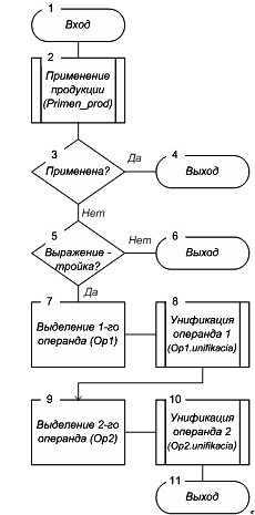 Действия данной операции определяются схемой на рисунке 9 и складываются из следующего. Тройка из продукции будет считаться удачно примененной к тройке из унифицируемого выражения, если, во-первых, совпадают операции троек; во-вторых, правила применимости выполняются для первых и вторых операндов троек.