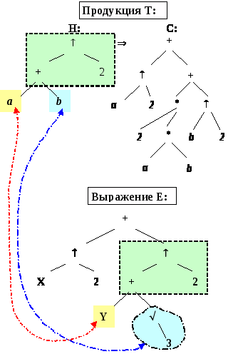 На рисунке одинаковыми цветными прямоугольниками выделены совпадающие фрагменты деревьев продукции и выражения; штрихпунктирными линиями – соответствие между свободными переменными и фрагментами дерева выражения.