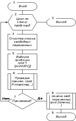 Для очередной продукции из списка (rpod) вызывается операция проверки применимости продукции (Primenima). Если операция возвращает истинное значение, то вызывается операция замены свободных переменных в правой части продукции.