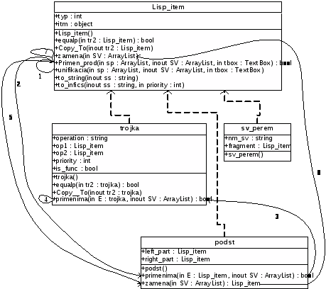 На рисунке 4 приведена диаграмма классов для реализации алгоритма унификации, на которой показана структура вызовов операций классов. Цифры над линиями указывают возможную последовательность вызовов. В рассматриваемой реализации алгоритма предполагается, что выражение представлено в префиксной форме. Описываться будут только те структуры данных и операции, которые связаны с принципом работы алгоритма унификации.