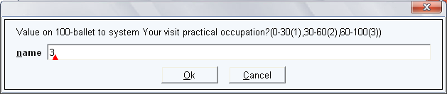 ask_name('Value on 100-ballet to system Your visit practical occupation?(0-30(1),30-60(2),60-100(3))', name, PP),