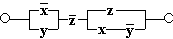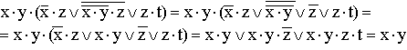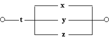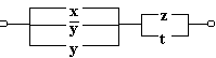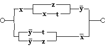 1. Побудуємо схему, що містить 4 перемикачі x, y, z і t, таку, щоб вона проводила струм тоді і тільки тоді, коли замкнути контакт перемикача t і який-небудь з інших трьох контактів.