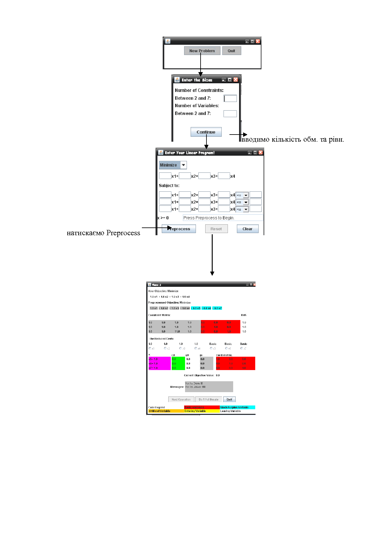 Після запуску програми на виконання програма пропонує ввести такі данні: а) кількість рівнянь та кількість обмежень; б) після цього з’являється вікно в якому потрібно ввести коефіцієнти функції та коефіцієнти рівнянь системи; в) потім потрібно вибрати куди прямує функція (МАХ або MIN); г) вибрати знаки рівності або нерівності (=, ≥, ≤)