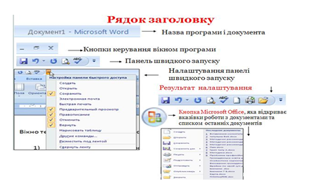 Вікно програми Word 2007 має стандартний вигляд для пакету програм Microsoft Office 2007. Варто розглянути рядок заголовку