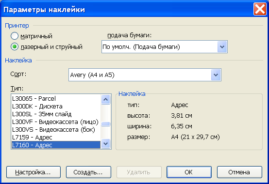 Сначала откроем новый основной документ и выберем в качестве его типа «Наклейки» (Рисунок 4). После этого откроется окно «Параметры наклейки» (Рисунок 14), в котором выберем тип используемых наклеек. Практически всегда информация о типе и размере этикеток нанесена на их упаковку, поэтому в данном окне необходимо выбрать тот же тип, который указан на упаковке, и нажать на кнопку «ОК».
