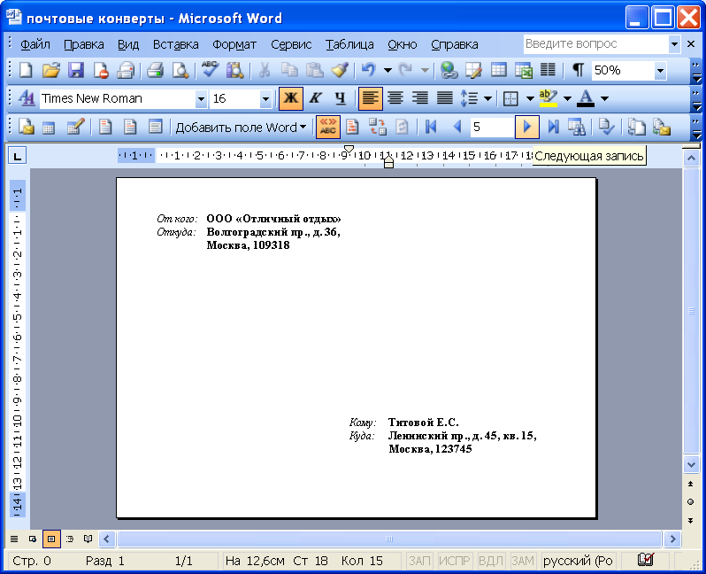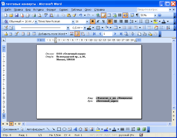 Обратите внимание: подготовленный основной документ можно использовать еще много раз для печати почтовых конвертов. Для этого надо всего лишь сохранить файл перед закрытием.