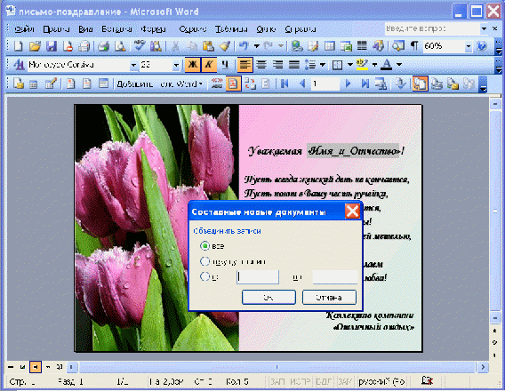 При подготовке электронных поздравлений функция «Слияние» тоже может сослужить вам добрую службу. При этом подготовка электронных поздравлений будет мало чем отличаться от создания поздравлений в виде писем или открыток на бумажном носителе. Основных отличий будет всего два:
