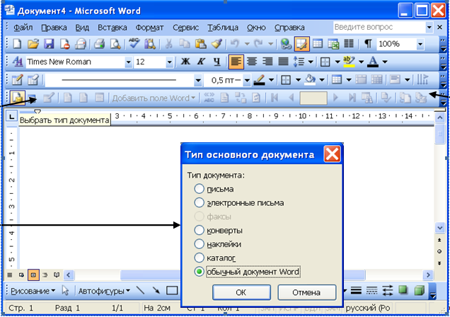 – Во-первых, при создании нового основного документа нужно будет выбрать тип «электронные письма», а не «обычный документ Word» (Рисунок 4).