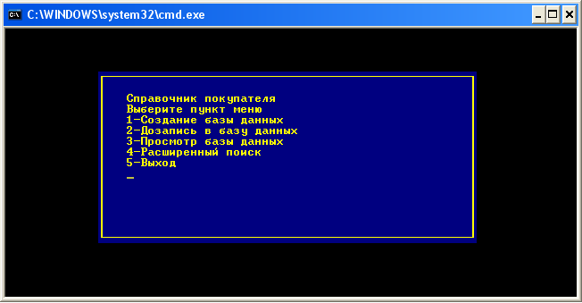 В данной программе выбор нужной действия в меню происходит с помощью нажатия клавиш с цифрами от 1 до 5.