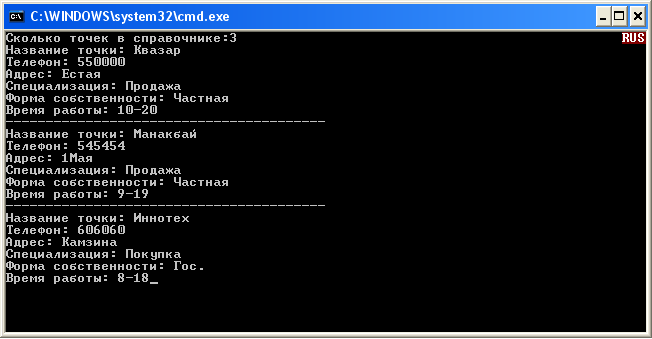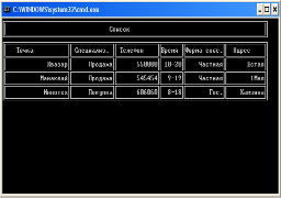 Для просмотра справочника необходимо выбрать в главном меню цифру «2», которая соответствует строке «Просмотр базы данных» и нажать клавишу Enter. Далее появится окно с информацией о торговых точках, хранящейся в справочнике, которая представлена в табличном виде. Для выхода в главное меню требуется нажать клавишу Enter.
