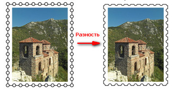 Далее нужно выделить прямоугольник и объект из кругов (не затрагивая фотографию в центре), а затем применить к выделению команду Контур→Разность. Должно получиться примерно как на рисунке выше. Вот марка и готова. Осталось только добавить цену марки, сгруппировать надпись, фотографию и зубчатый контур.